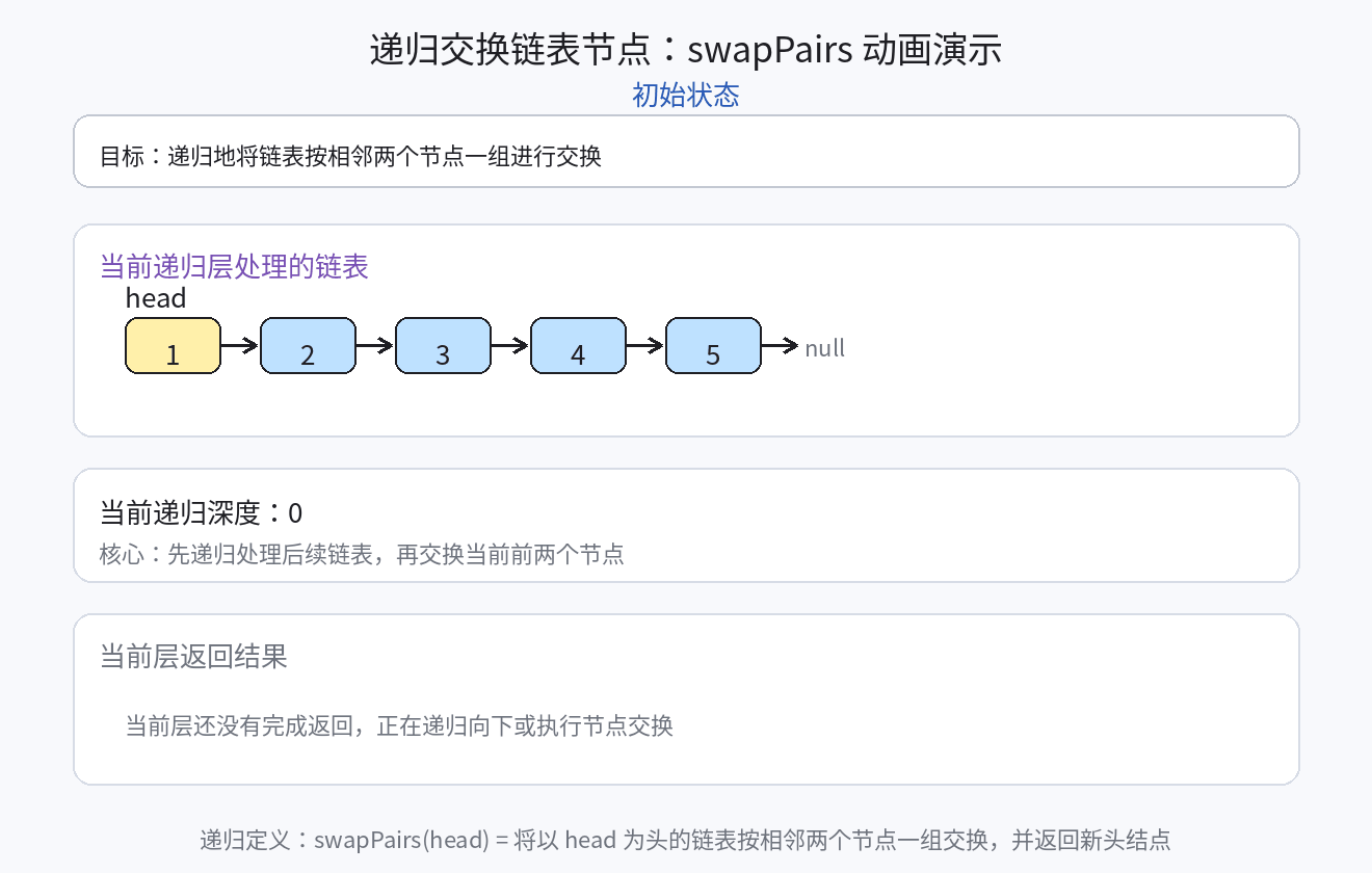 - 递归函数的含义:交给你一个链表,将这个链表两两交换一下,然后返回交换后的头结点;