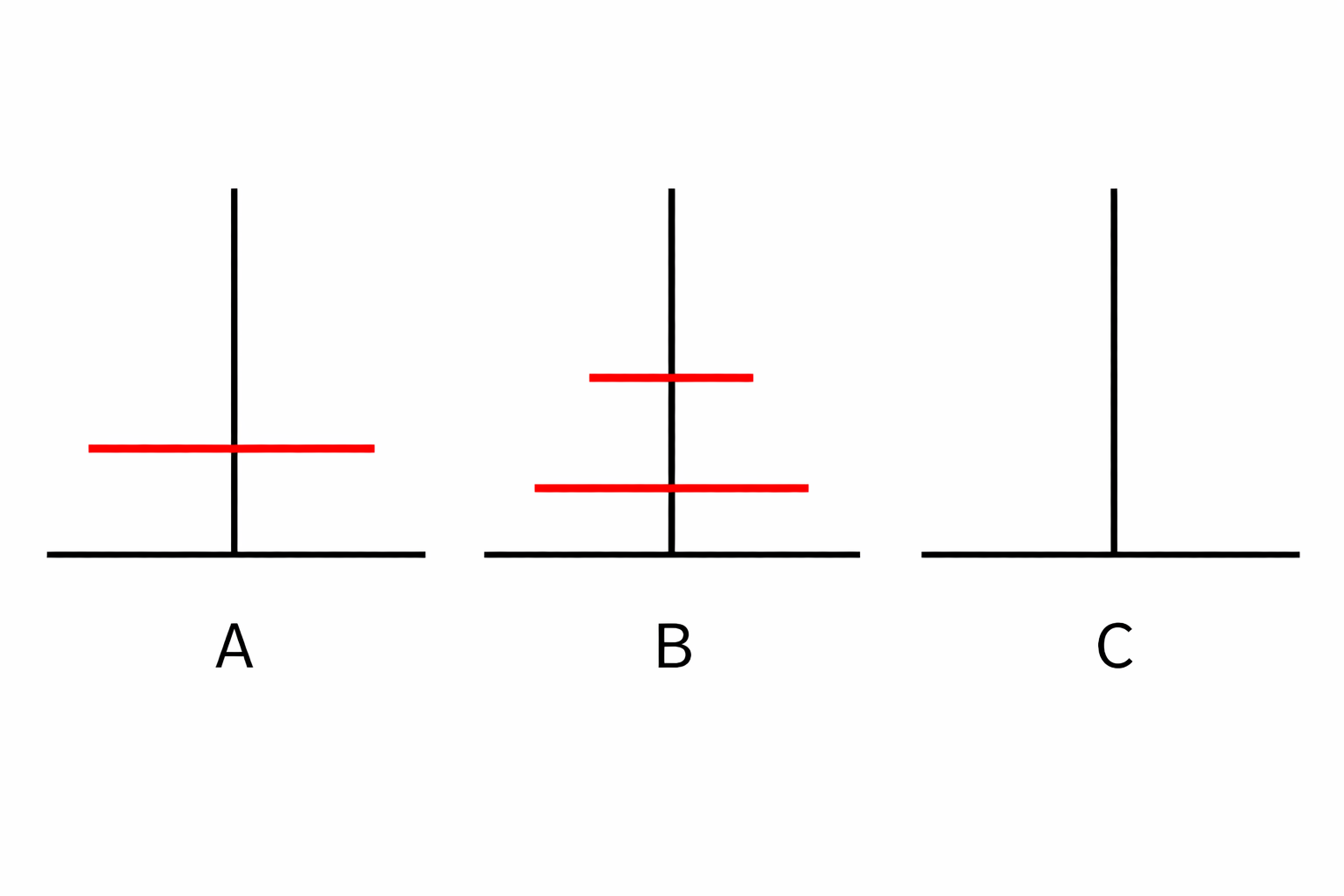 - 将A中最上面的一个盘子挪到C中;