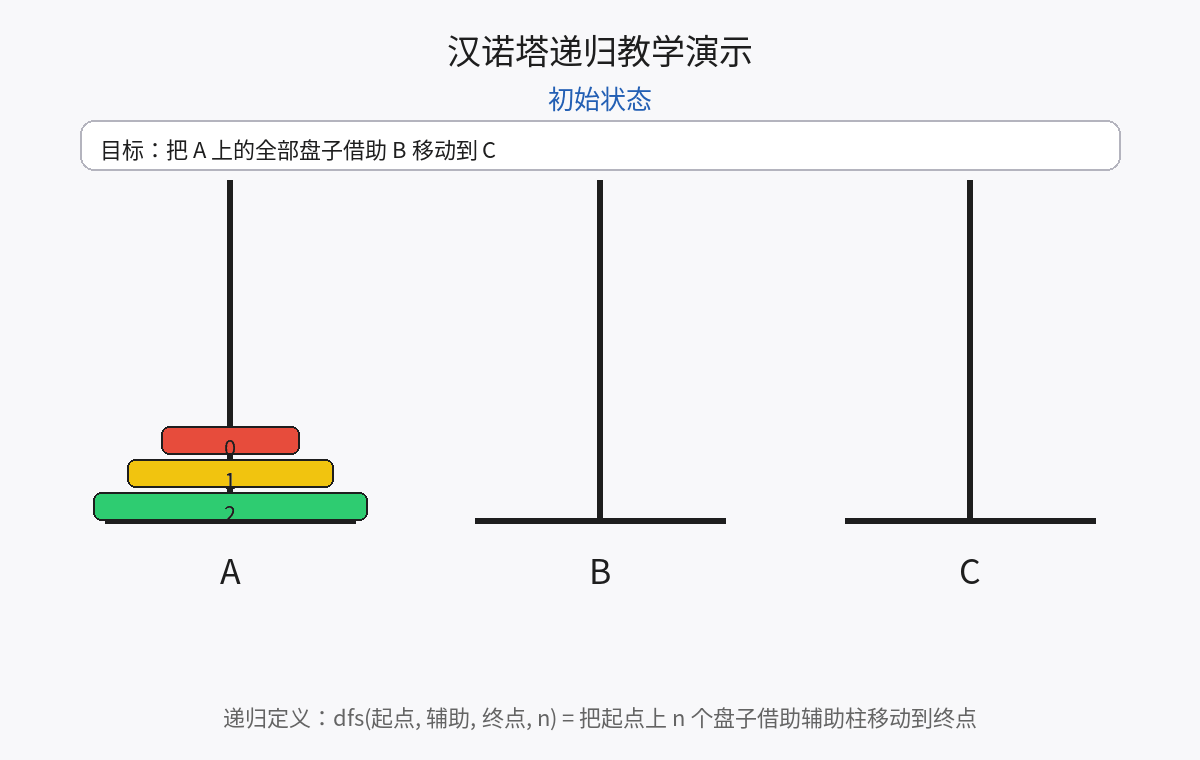 - 当前问题规模为n=1时,直接将A中的最上面盘子挪到C中并返回;