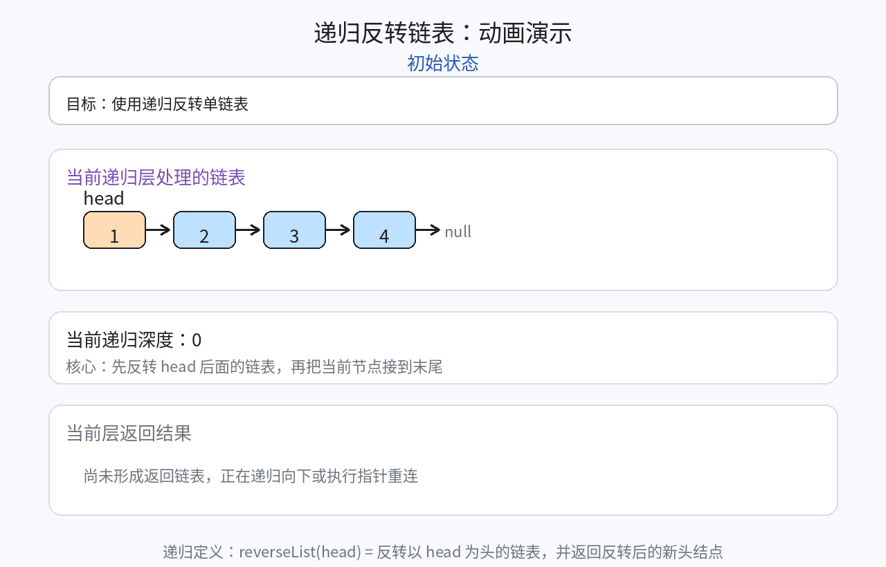 - 递归函数的含义:交给你一个链表的头指针,你帮我逆序之后,返回逆序后的头结点;