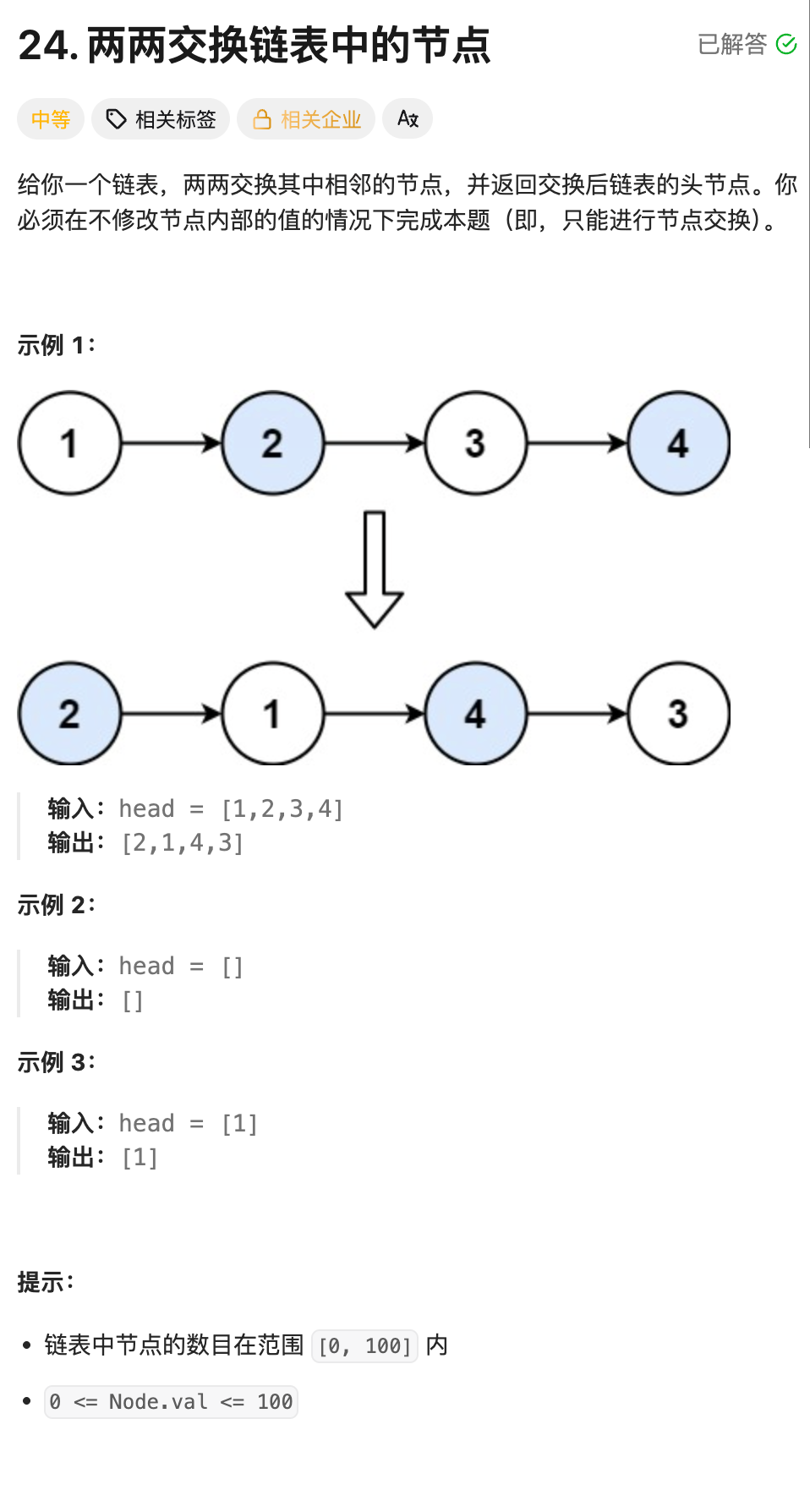 - 函数体:先去处理一下第二个结点往后的链表,然后再把当前的两个结点交换一下,连接上后面处理后的链表;