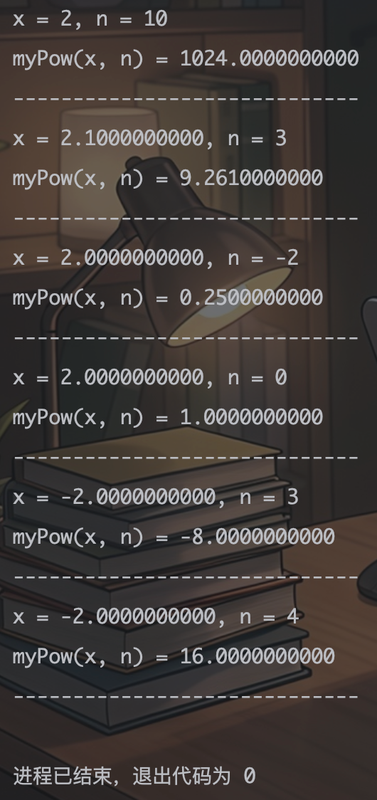 cout << "myPow(x, n) = " << fixed << setprecision(10) << ans << endl;
