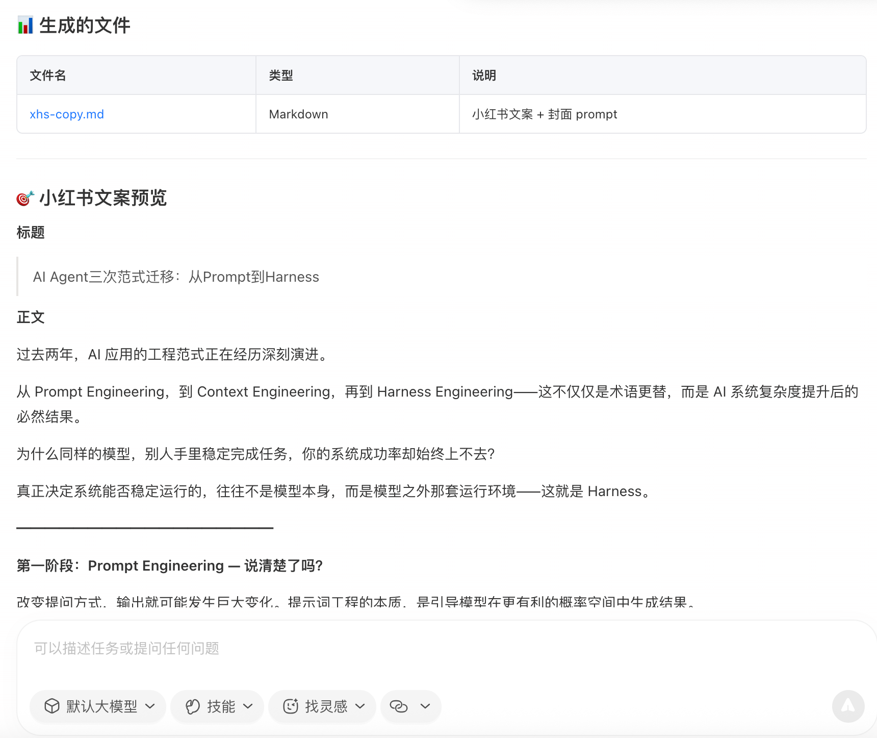 2、使用上面的内容调用 content-repurposer 生成小红书文案