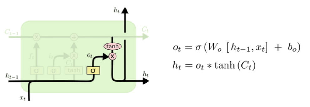 先用tanh将 Ct 的值缩放至-1~1,再通过输出门 ot 决定哪些信息最终输出。