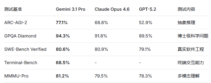 Gemini 3.1 Pro在ARC-AGI-2基准测试中拿下**77.1%**的验证得分,是前代Gemini 3 Pro(31.1%)的两倍以上。该测试专门评估模型在从未见过的新逻辑模式下的泛化与推理能力,而人类参与者平均正确率约为60%。