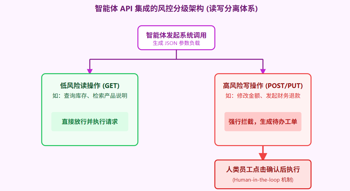 因此,在设计企业级智能体的集成架构时,必须对 API 权限进行严格的“读写分离”,并引入强制的 Human-in-the-loop(人在回路) 审批机制。