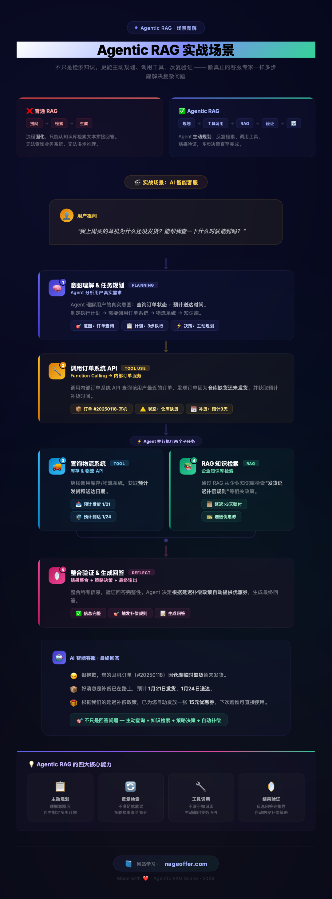 - Agentic RAG:把 RAG 和 Agent(后面会讲)结合起来。模型可以自主决定需不需要检索、搜什么关键词、结果不够好要不要换个方式再搜,而不是机械地走固定流程