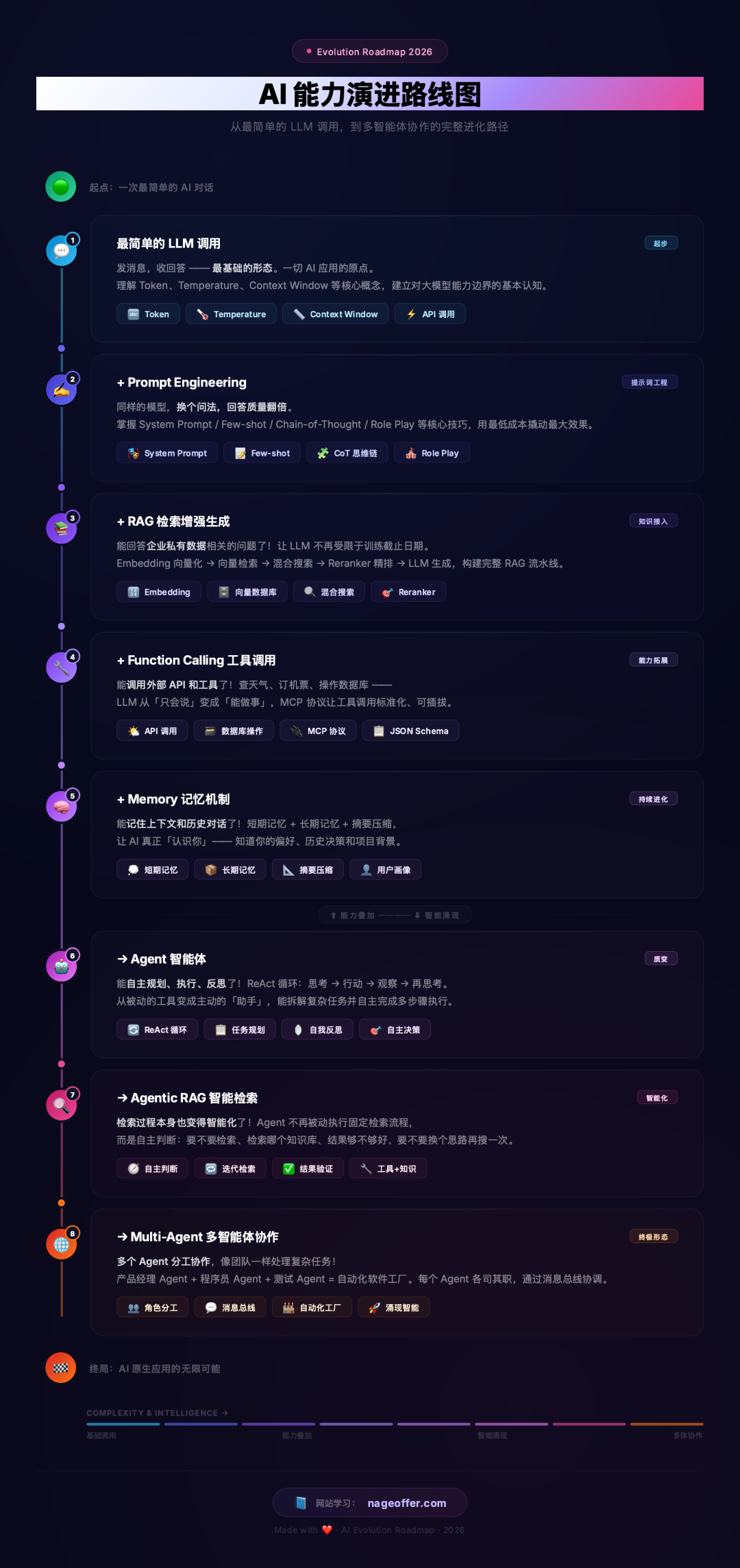 | 🟠 第三阶段 | RAG 优化、高级 Agent、MCP、工程化全家桶 | 持续 | 持续 | 生产级 AI 应用 |