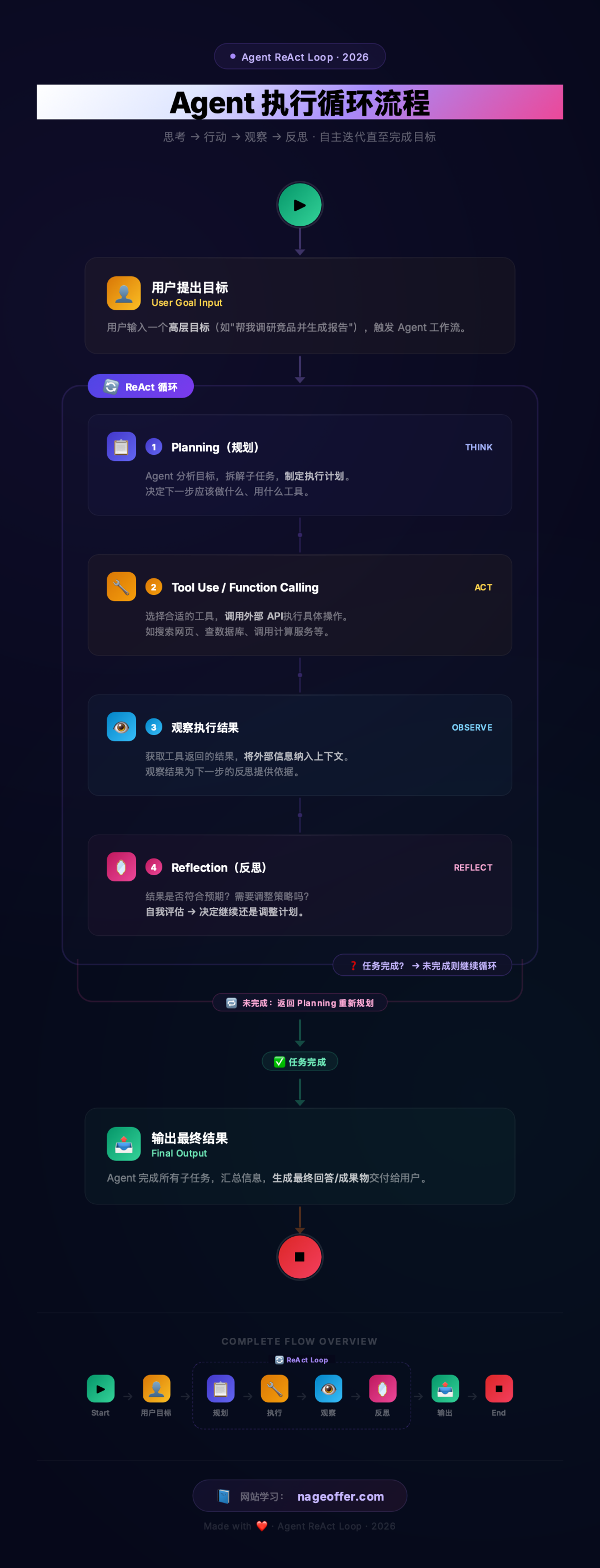 Agent 是这一层的核心概念。它不是调用一次模型就结束,而是一个循环系统: