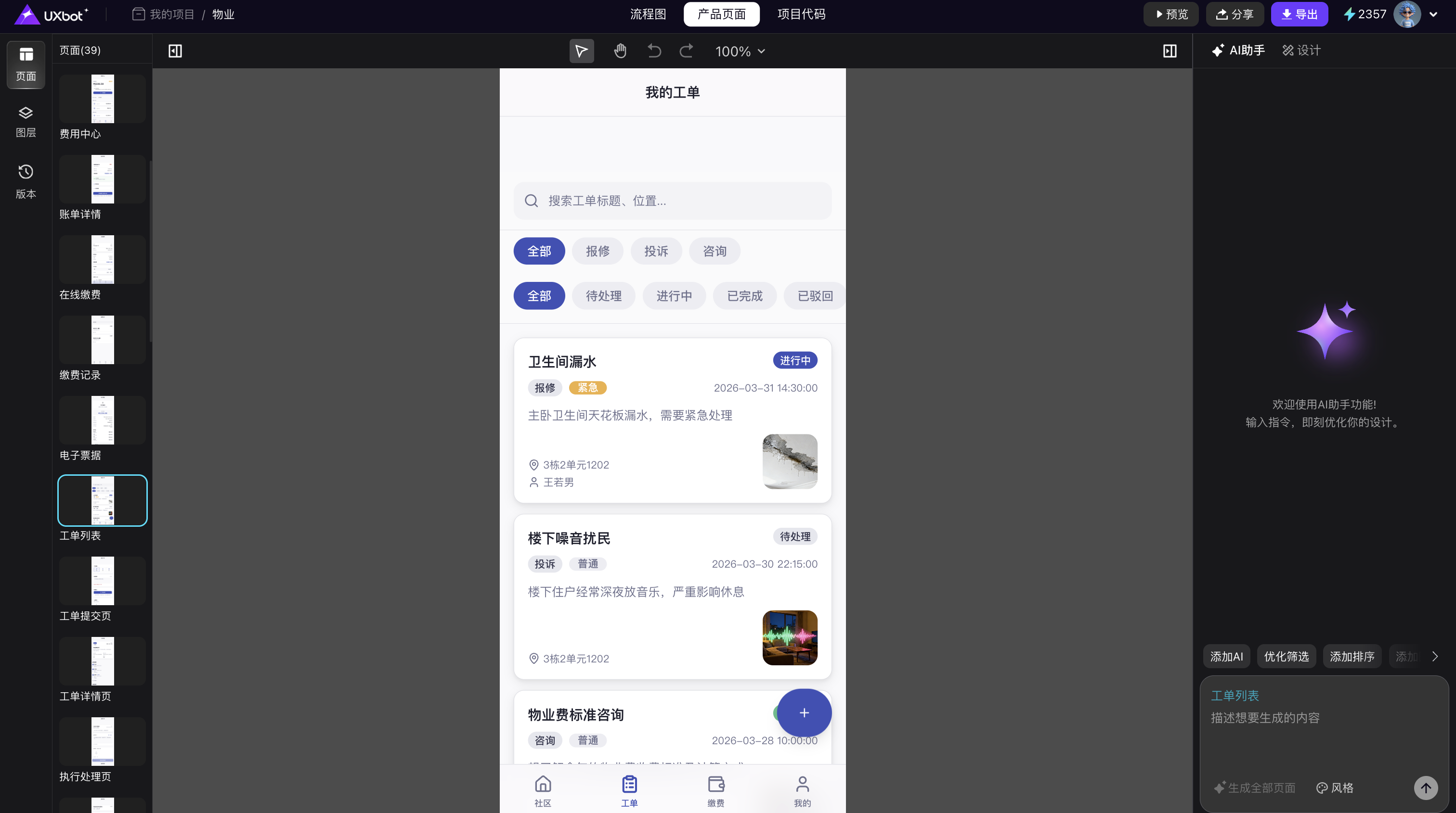 核心能力详解: 一次性生成完整多页面界面。输入产品需求描述,UXbot生成包含所有核心页面在内的完整界面,而非单页面逐步追加。这意味着第一轮生成后就可以获得一个完整的多页面界面框架,而不是只有一个首页。