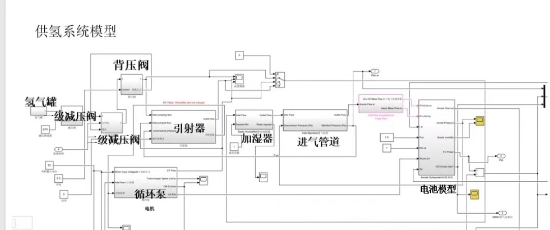 - 进排气管道和加湿器模型:和空气系统类似,这部分负责氢气的流动特性以及湿度调节。