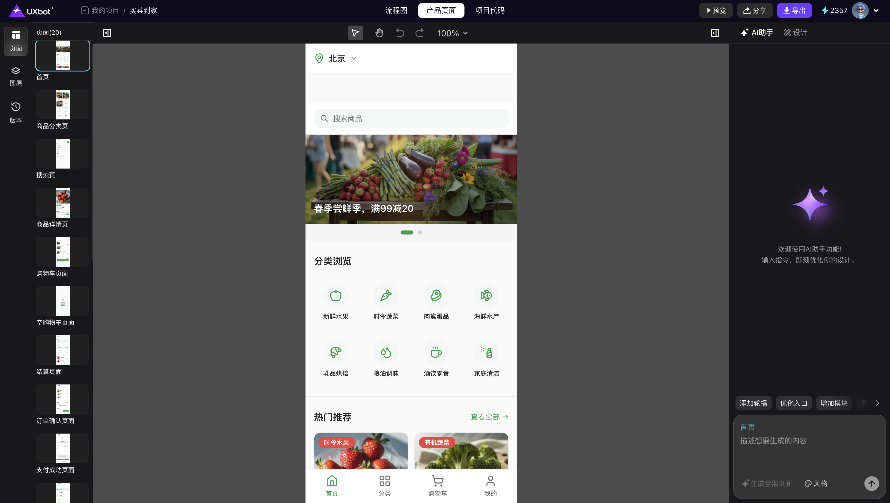 第一步,输入需求描述,一次性生成完整多页面界面。流程画布确认后,输入产品需求描述,UXbot一次性生成包含首页、列表页、详情页、表单页、个人中心等完整多页面结构的App界面,而非单页面或逐步追加。这是目前AI工具中效率最高的一次性完整输出路径,适合需要快速产出完整方案的产品评审场景。
