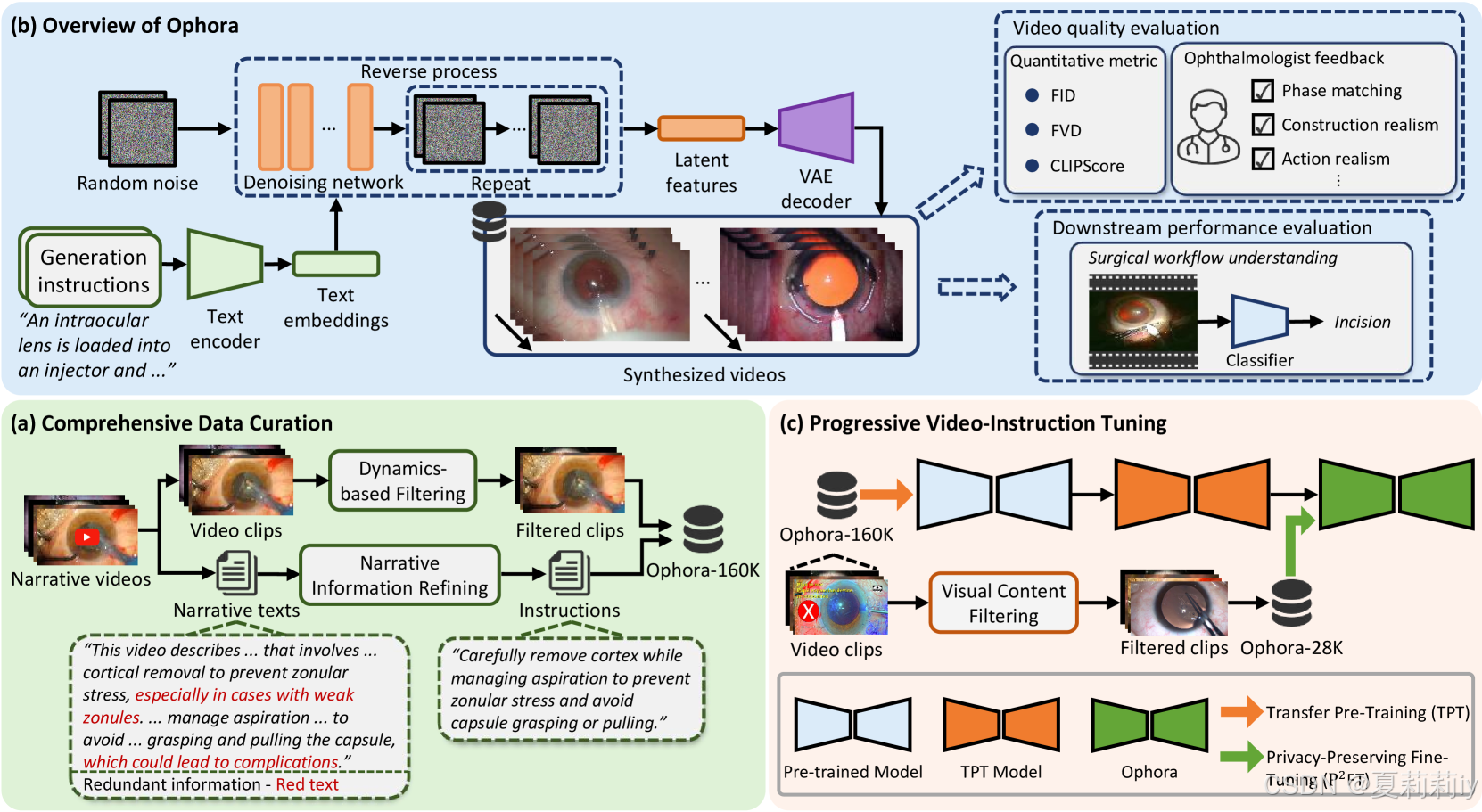 ⑤从OphClip里删去分辨率低于720×480的片段,构建了一个大规模视频教学数据集Ophora-160K,包含约160K个剪辑级视频指令对