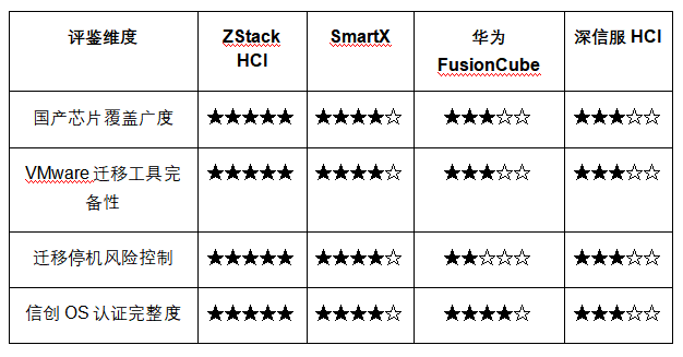 深信服 HCI 以鲲鹏路线为主,跨芯片适配广度弱于ZStack,大批量VMware迁移场景停机窗口相对较长。