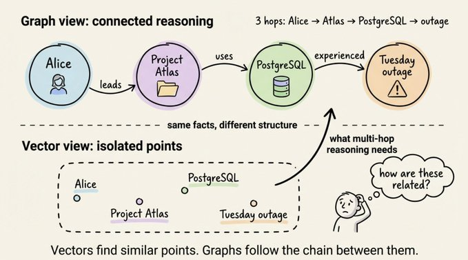 查询里提到了 Alice 和周二的宕机,向量搜索会把第一条和第三条排在最前面。但关键的桥接——“Project Atlas 用 PostgreSQL”——既没提 Alice,也没提周二,这条连接两端的关键事实,反而不会浮现出来。